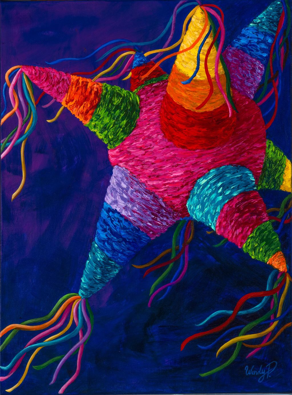“Piñata” finger painting with brush work. Impasto Oil Paint texture on 18”x24” Gallery archival-quality cotton canvas.